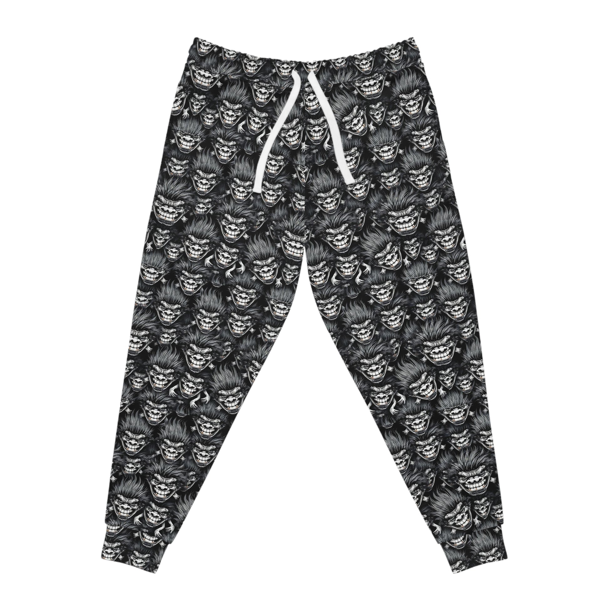 These joggers wear like a mood. The charcoal all-over pattern repeats a snarling, shadowy face that reads both bold and strangely cozy — the kind of print that slips easily from late-night studio sessions to slow weekend mornings. Cut from a soft, slightly stretchy polyester blend, the tapered silhouette and elastic drawstring waist move with you, while double-layer side pockets keep small essentials secure. They feel lived-in from the first wear: warm without overheating, textured without being stiff. Pair them with a chunky tee or a worn-in hoodie when you want to lean into a darker, artful wardrobe or pull them on after a long day and sink into something with attitude.