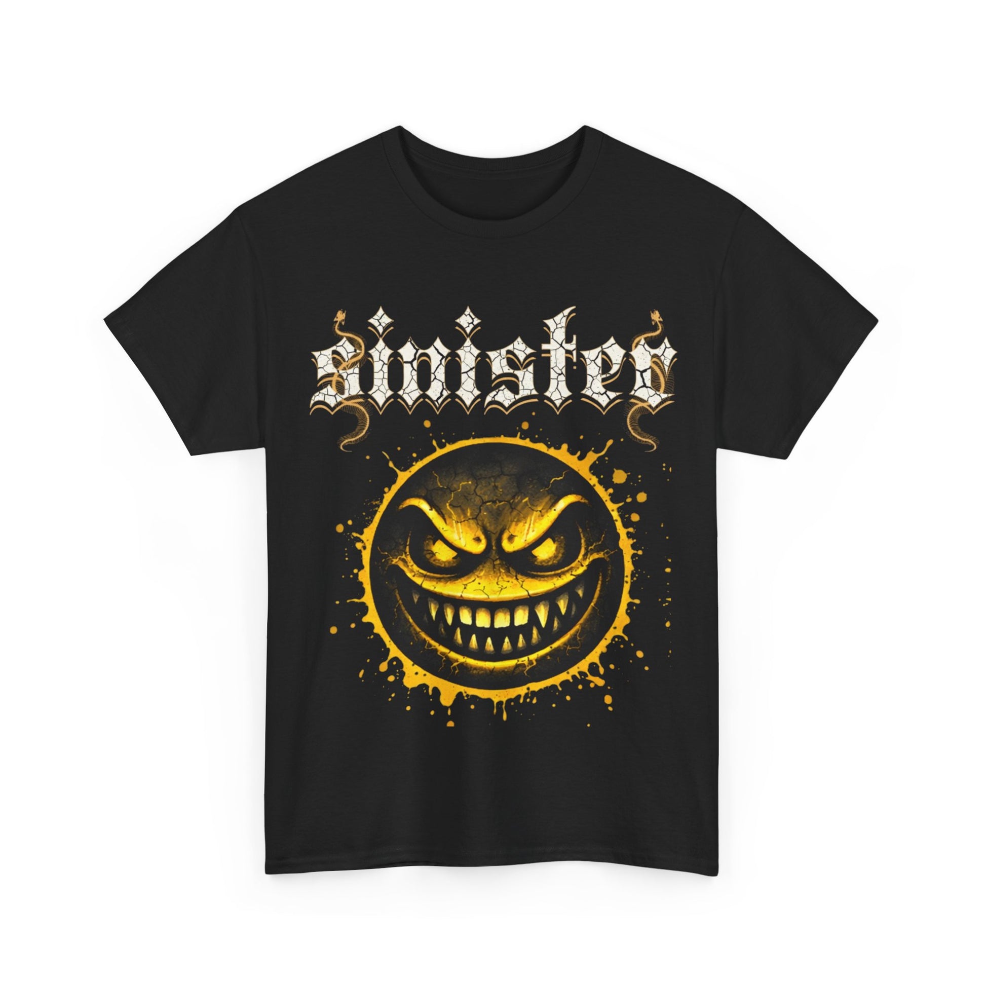 A bold, dark tee that channels underground energy — a black crew shirt printed with a snarling, grinning sun rendered in molten yellow and gold tones beneath a jagged, gothic wordmark. The design reads like a riff on vintage metal and skate graphics: gritty ink splatters, textured highlights, and an aggressive smile that refuses to be polite. Wear it to shows, late-night hangs, or when you want your outfit to speak louder than words. The classic cut keeps the silhouette familiar and comfortable while the high-contrast print stays vivid wash after wash, so the attitude lasts as long as you do.
