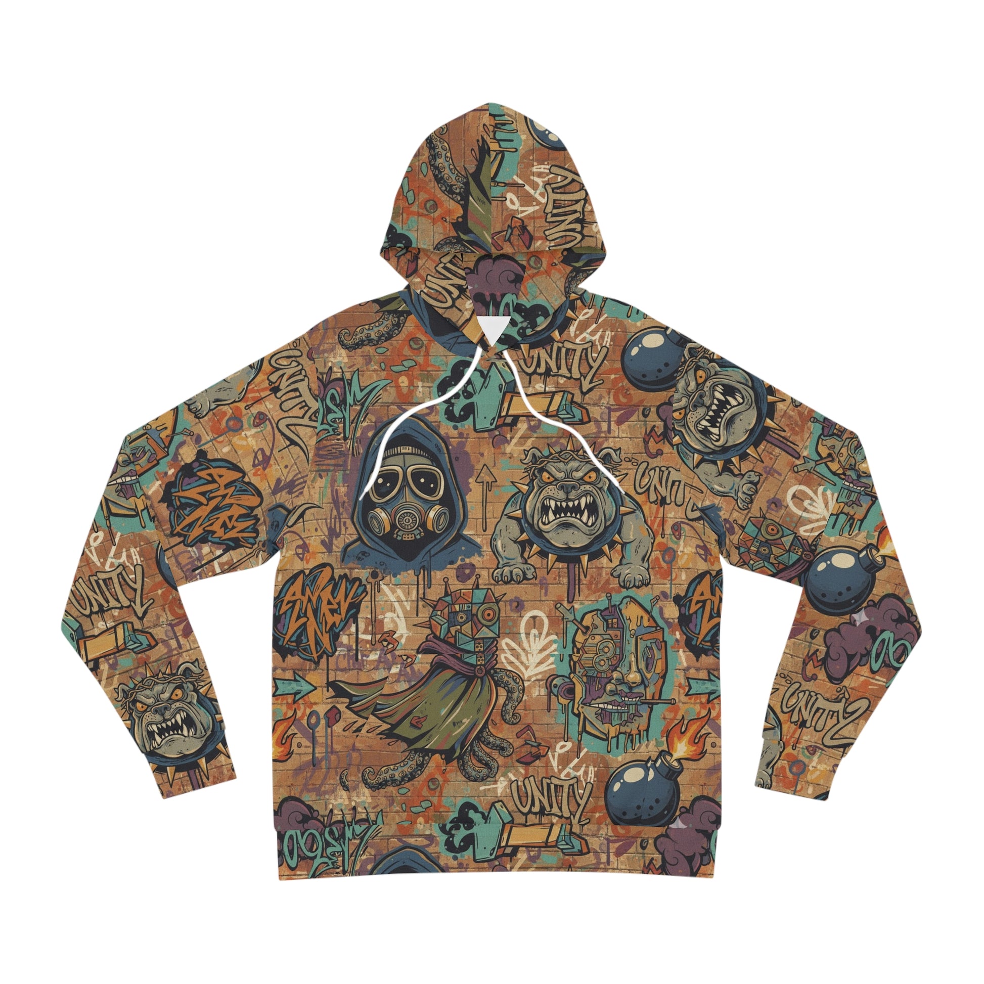 This hoodie feels like a late-night alley with a paint-splattered heart — gritty, artful, and alive. The all-over graffiti print layers masks, characters, tags and textures in warm brick tones with teal and plum pops. Slip it on when you want to stand out without shouting; the roomy kangaroo pocket and adjustable hood make it easy to move through city streets, skate parks, or creative meet-ups. The fabric has a smooth, slightly substantial hand that holds the print well, so the artwork reads like a wearable mural that ages with you. For people who live at the intersection of street art and self-expression, this hoodie becomes part of the daily canvas.