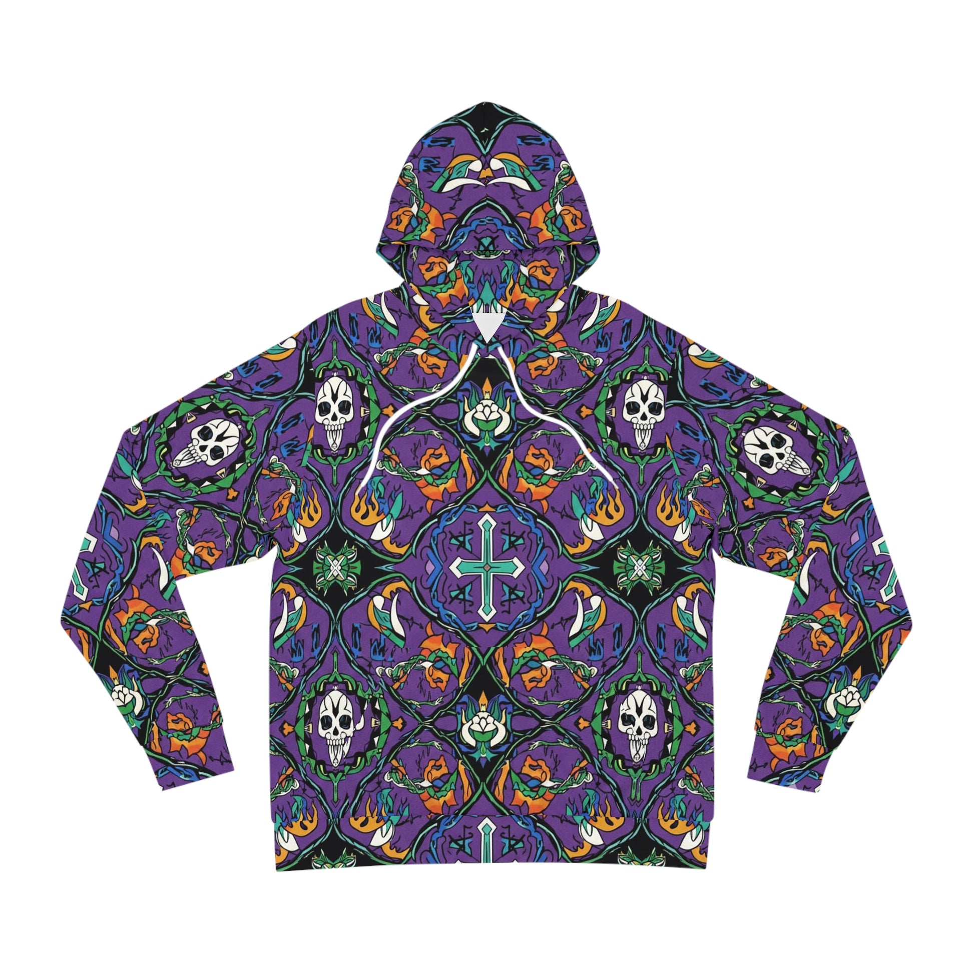 Dive into a bold, gothic statement piece that feels like a midnight alley in fabric form. This hoodie wraps you in deep purples, carved crosses, flickering flames and whispering skull motifs that loop into a repeating, ornate tapestry. Wear it when you want your look to read like a story — moody, mischievous, and a little mysterious. It layers easily over band tees or chunky knits and transforms cold evenings into a scene: lantern light, crackle of leaves, a late-night walk where every shadow seems alive. For fans of dark art, alternative fashion, or seasonal Halloween styling, this hoodie becomes part of the mood — expressive, tactile, and unapologetically vivid.