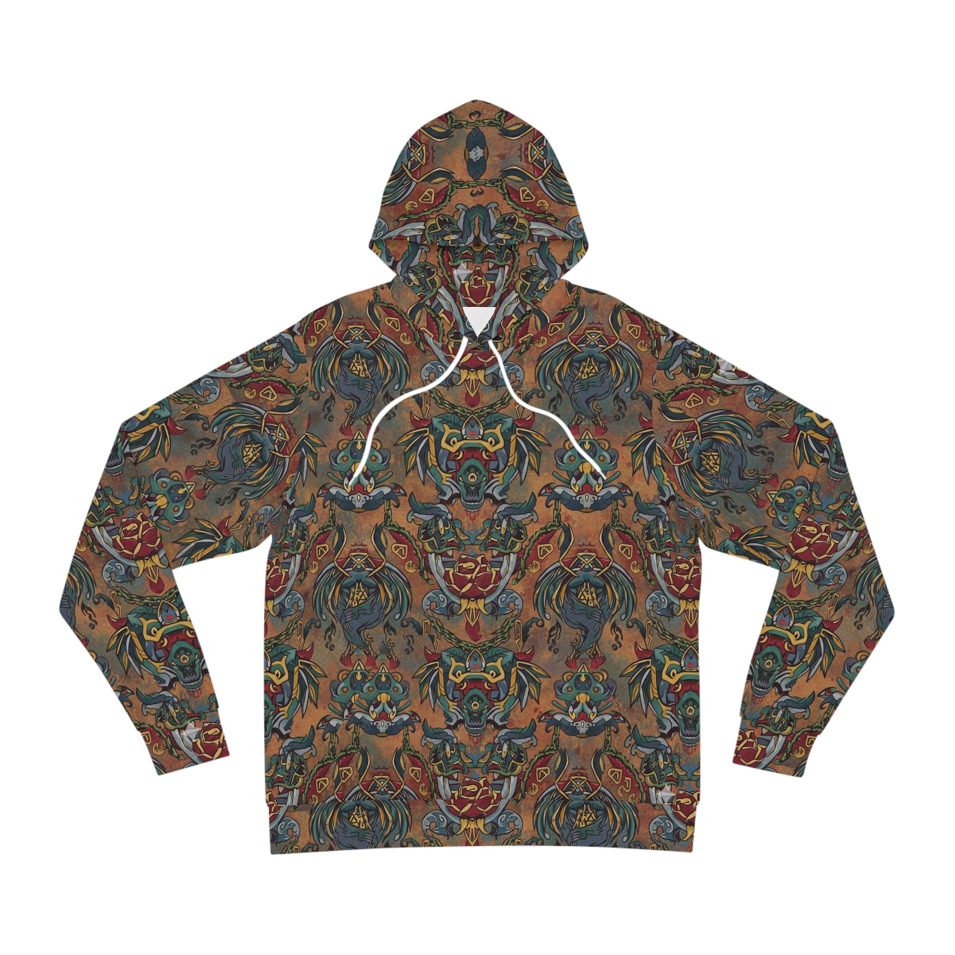 This all-over print hoodie wraps you in a warm, artful pattern that feels like a wearable tapestry. The layered, earthy design blends deep russets, muted teals, and antique golds into a repeating motif with a slightly vintage, hand-painted vibe. It settles into your wardrobe as a statement piece that still feels familiar — the kind of hoodie you reach for when you want comfort with personality. The roomy kangaroo pocket and adjustable hood make it easy to pull on for an afternoon of urban wandering, late-night coffee runs, or cozying up at a creative studio session. The medium-weight fabric holds the print with clarity while keeping the silhouette structured. Wear it with worn denim or layered under a coat when the temperature drops; it adds a crafted, slightly bohemian touch without shouting for attention.